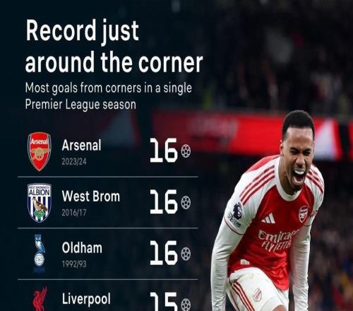 阿森納本賽季英超角球進(jìn)球14個(gè),距離聯(lián)賽歷史紀(jì)錄僅差2球