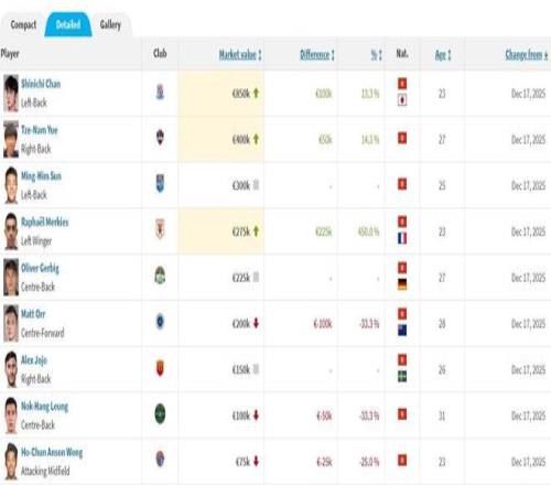 德轉(zhuǎn)中超聯(lián)賽中國(guó)香港球員身價(jià)榜