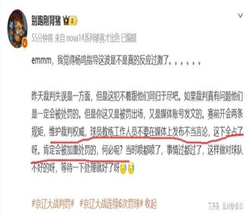 CBA常規(guī)賽第3輪,四冠王遼寧隊在客場不敵北京隊,遭遇到本賽季第一場敗仗。不過,這一場比賽的最大爭議點還在于,末節(jié)最后6分鐘,楊鳴因不滿裁判判罰,被直接連吹涼T,當場驅逐出場。而在賽后,楊鳴更是連夜更新社媒,疑似回擊對裁判吹罰的不滿。而從CBA過往的經(jīng)驗來看,遼寧隊和楊鳴大概率會遭到籃協(xié)的重罰,畢竟,新賽季開始前,他們已經(jīng)一再強調,教練員和球員不得在社媒上炮轟裁判以及吹罰。