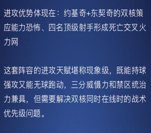 對于約基奇與東契奇的雙核組合,AI明確點出了持球核心同時在場時的戰(zhàn)術兼容性問題,提出需要「解決核心同時在線時的戰(zhàn)術優(yōu)先級問題」,以避免核心球員相互制約;同時建議設計更多高位策應與傳切配合,充分發(fā)揮雙核擋拆的破壞力。