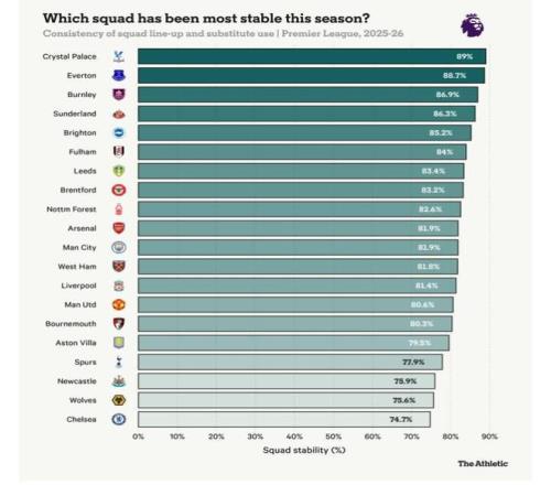 12月18日,The Athletic發(fā)布文章,對(duì)本賽季英超各隊(duì)的出場(chǎng)陣容穩(wěn)定度進(jìn)行了分析,其中,水晶宮是穩(wěn)定度最高的球隊(duì),切爾西最低。