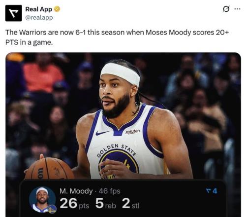 同時這是本賽季穆迪第7次拿到20+得分表現(xiàn),當他拿下20+得分時,勇士交出6勝1負戰(zhàn)績。