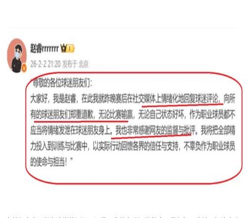 2月2日,晚上9點(diǎn)!北京隊(duì)球員趙睿,通過(guò)網(wǎng)絡(luò)平臺(tái)發(fā)文,正式向球迷進(jìn)行道歉!