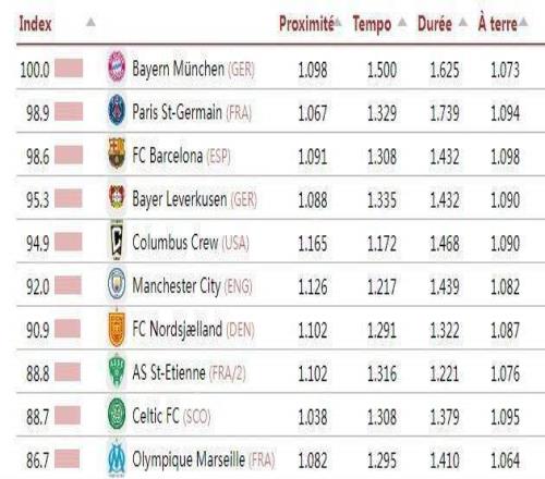知名數(shù)據(jù)評(píng)測(cè)機(jī)構(gòu)足球天文臺(tái)(CIES)基于合作伙伴Impect的數(shù)據(jù),結(jié)合58個(gè)主流聯(lián)賽公布了全球最具“控球主導(dǎo)、傳控風(fēng)格”的球隊(duì)排名,拜仁以100分的基準(zhǔn)分登頂榜首,巴黎巴薩分列二三位。數(shù)據(jù)核心排名標(biāo)準(zhǔn)通過(guò)以下四項(xiàng)技術(shù)指標(biāo)綜合評(píng)定:傳球距離(越短越好)、控球階段的傳球速度、平均單次控球時(shí)長(zhǎng),以及在前場(chǎng)三分之一區(qū)域,膝蓋以下接球的百分比。排名第一的拜仁獲得了100分的綜合評(píng)分(即其他球隊(duì)以拜仁的100分作為綜合指標(biāo)),巴黎、巴薩作為二、三名分獲98.9和98.6分。第4-10名分別為:勒沃庫(kù)森(德甲)、哥倫布機(jī)員(美職聯(lián))、曼城(英超,92分)、北西蘭(丹麥超)、圣埃蒂安(法乙)、凱爾特人(蘇超)、馬賽(法甲)。11-20名分別為:布拉加(葡超)、博德閃耀(挪超)、吉達(dá)聯(lián)合(沙特聯(lián))、皇馬(西甲,84分)、哈馬比(瑞典超)、圣地亞哥(美職聯(lián))、錫爾克堡(丹麥超)、利物浦(英超,81.9分)、洛杉磯FC(美職聯(lián))和埃爾切(西甲)