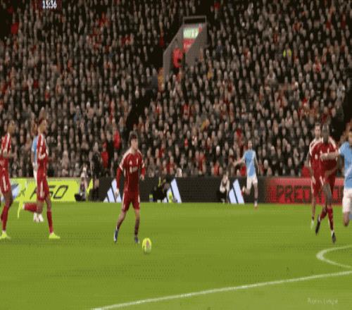 第100分鐘,利物浦全線壓上,謝爾基中圈附近傳球,索博斯洛伊看到空門立即拉拽哈蘭德,哈蘭德也還以顏色,皮球緩緩滾入球門。