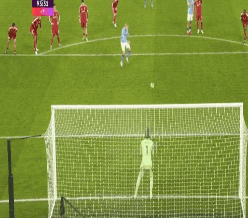 第93分鐘,哈蘭德操刀主罰,騙過阿利松,將球打進,曼城反超比分。