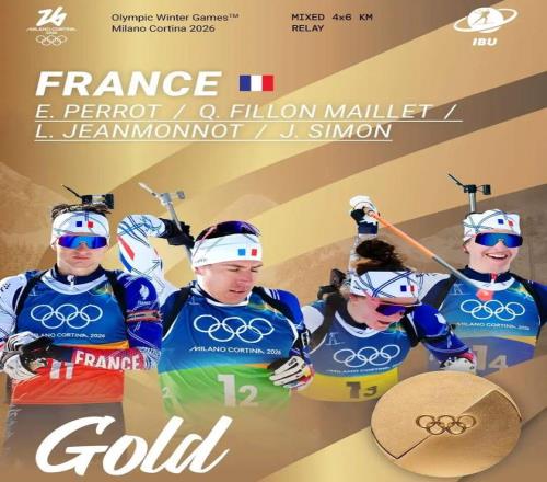 冬季兩項4x6公里混合接力,法國隊奪得冠軍,這也是法國代表團在本屆冬奧會上的首枚金牌,意大利隊和德國隊分別獲得銀牌和銅牌。