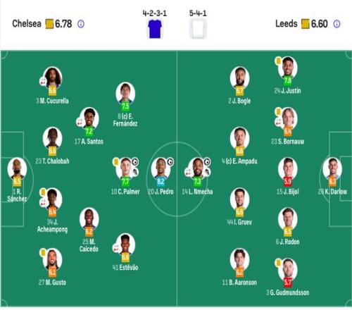 切爾西首發(fā):1-桑切斯、27-古斯托、34-喬什·阿昌龐(79’29-福法納)、23-查洛巴、3-庫(kù)庫(kù)雷利亞(46’21-哈托)、25-凱塞多、17-桑托斯(79’9-德拉普)、10-帕爾默、8-恩佐、41-埃斯特旺(64’7-內(nèi)托)、20-若昂·佩德羅。