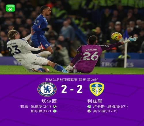 北京時間2月11日英格蘭足球頂級聯(lián)賽第26輪,切爾西主場對陣?yán)澛?lián)。上半場,帕爾默助攻,佩德羅挑射破門。下半場,佩德羅造點,帕爾默主罰命中,隨后,利茲聯(lián)連入兩球,扳平比分,恩梅加點射破門,奧卡福爾推射建功。最終比分切爾西 2-2 利茲聯(lián)。