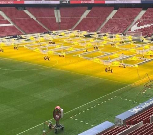 目前距離馬競(jìng)對(duì)陣巴薩的首回合比賽僅剩48小時(shí)左右,球場(chǎng)內(nèi)近一半?yún)^(qū)域覆蓋著生長(zhǎng)燈——這類模擬陽(yáng)光的燈具常被用于高水平草坪的維護(hù)。2024年起,大都會(huì)球場(chǎng)開始使用Hatko Hybridgrass,這是一種新一代混合草皮,由西班牙公司Royalverd負(fù)責(zé)安裝并提供技術(shù)支持。