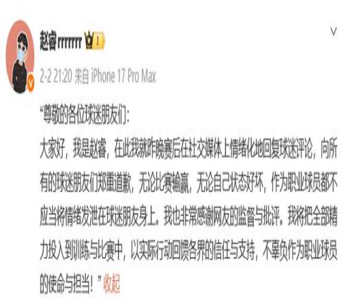 他表示,無論比賽輸贏,無論狀態(tài)好壞,作為職業(yè)球員都不應(yīng)當(dāng)將情緒發(fā)泄在球迷朋友身上。非常感謝網(wǎng)友的監(jiān)督與批評,我將把全部精力投入到訓(xùn)練與比賽中,以實際行動回饋各界的信任與支持,不辜負(fù)作為職業(yè)球員的使命與擔(dān)當(dāng)。