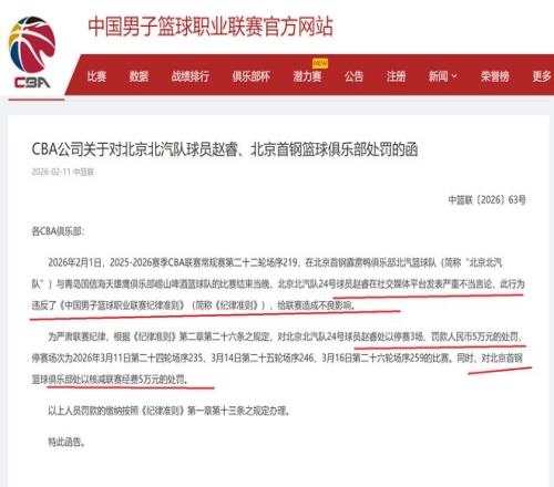 與此同時,CBA公司還對北京隊也進行了處罰,核減北京隊聯(lián)賽經(jīng)費50000元!