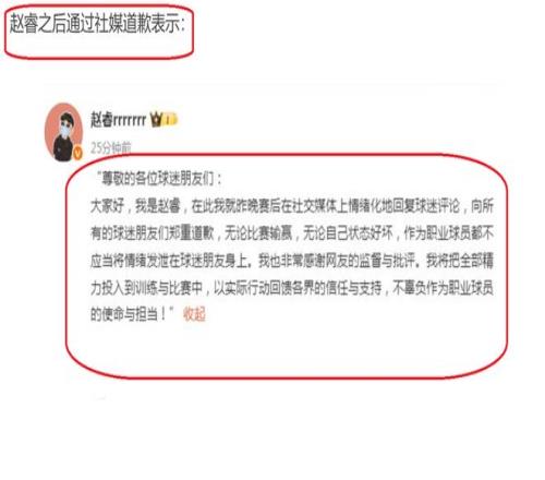 后來,趙睿也是認識到了自己的問題,于是就通過網(wǎng)絡平臺,向球迷進行道歉,表示自己在輸?shù)舯荣愔?,情緒化地回應了球迷的評論,很不應該,特地向球迷進行道歉!自己作為一名職業(yè)籃球運動員,不管是任何情況下,都不能夠?qū)⒆约旱那榫w發(fā)泄到球迷身上。接下來,自己也會反思,會將所有的精力用在訓練和比賽上,同時,也是感謝球迷的監(jiān)督和批評。