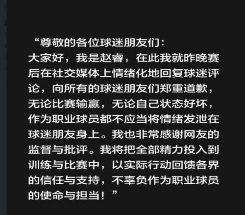 事后,趙睿在社交媒體上向新疆球迷道歉,但是仍然無法獲得很多球迷的諒解,認為他的言語破壞了民族團結。