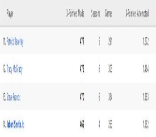 小賈巴里-史密斯三分命中數(shù)(470+)超過弗朗西斯升至隊(duì)史第13位。