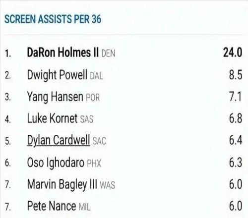 除了罰球優(yōu)秀,小楊還有一項高階數(shù)據(jù)排名聯(lián)盟前三,真的讓人沒想到。根據(jù)NBA官網(wǎng)的統(tǒng)計,球員每36分鐘的掩護助攻,小楊是7.1次,排名聯(lián)盟第三!第一名是霍姆斯,第二名是鮑威爾。從小楊不多的出場時間里,我們也經(jīng)常能看到,小楊的掩護質(zhì)量很高,今天的比賽中,小楊就給亨德森做了一次精彩的“戈塔特掩護”,亨德森突破到籃下,小楊在油漆區(qū)掛住了貝利和辛森兩個人,直接讓亨德森上空籃了,這就是小楊在進攻端的隱形價值。
