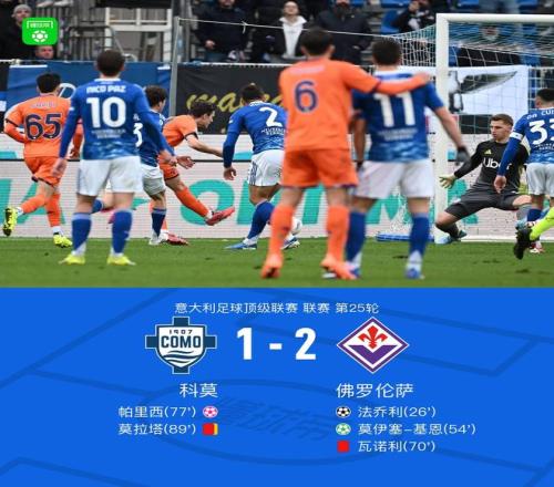 北京時(shí)間2月14日意大利足球頂級(jí)聯(lián)賽第25輪,科莫主場(chǎng)對(duì)陣佛羅倫薩。佛羅倫薩法喬利率先破門(mén),隨后莫伊塞-基恩點(diǎn)球破門(mén),帕里西自擺烏龍,比賽最后階段,莫拉塔抱怨裁判連吃?xún)牲S被紅牌罰下。最終十人科莫 1-2不敵佛羅倫薩。