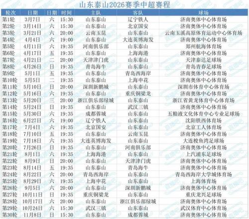 2月14日晚,2026賽季中超聯(lián)賽賽程正式公布,聯(lián)賽將于3月6日開(kāi)幕,揭幕戰(zhàn)放在了成都鳳凰山體育公園,由成都蓉城對(duì)陣深圳新鵬城。山東泰山新賽季上半程占據(jù)適當(dāng)?shù)闹鲌?chǎng)優(yōu)勢(shì),其中3月14日主場(chǎng)對(duì)國(guó)安、4月17日主場(chǎng)對(duì)海港、5月5日主場(chǎng)對(duì)申花,如果這三場(chǎng)比賽打好,將奠定整個(gè)賽季的基調(diào)。